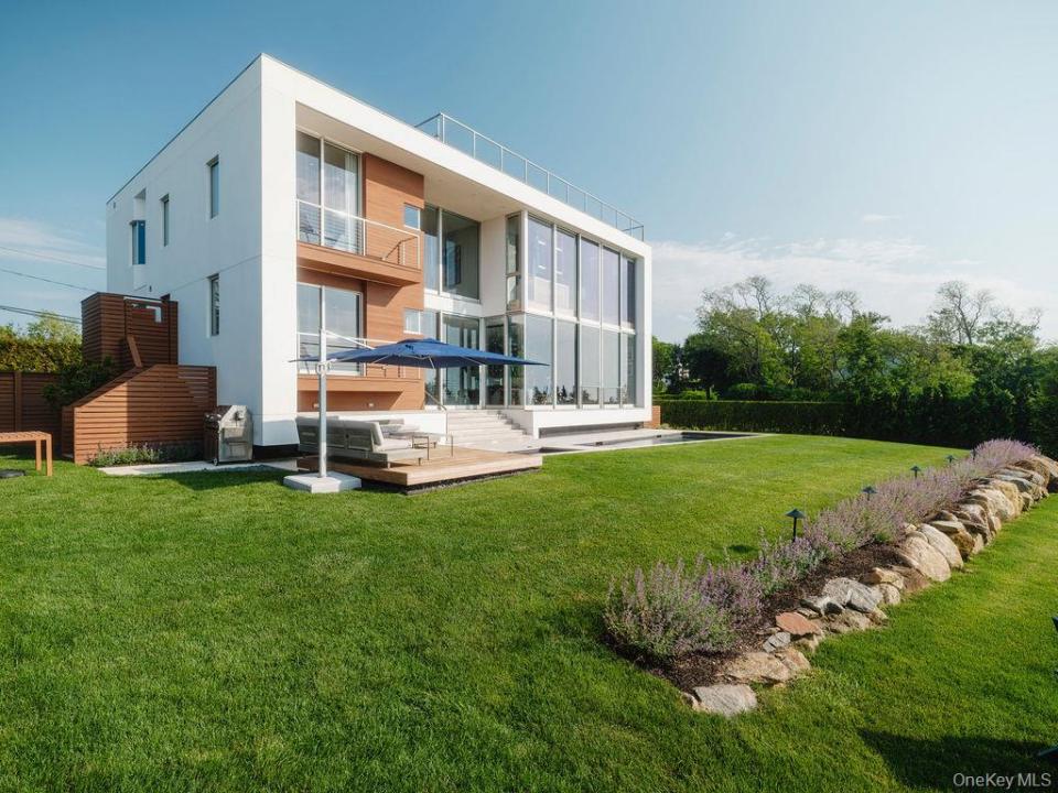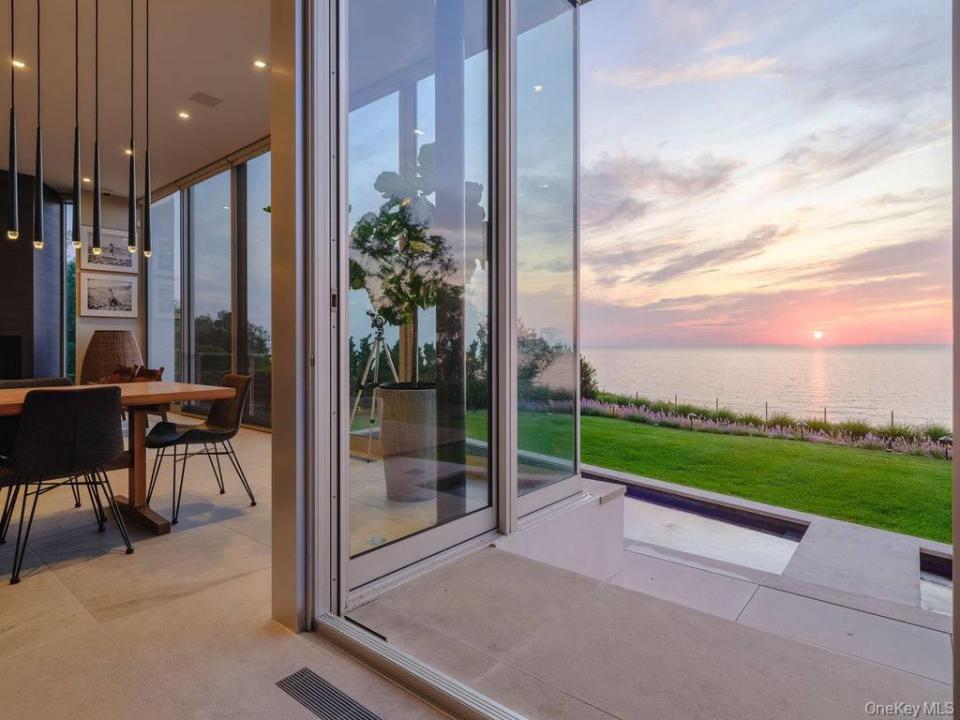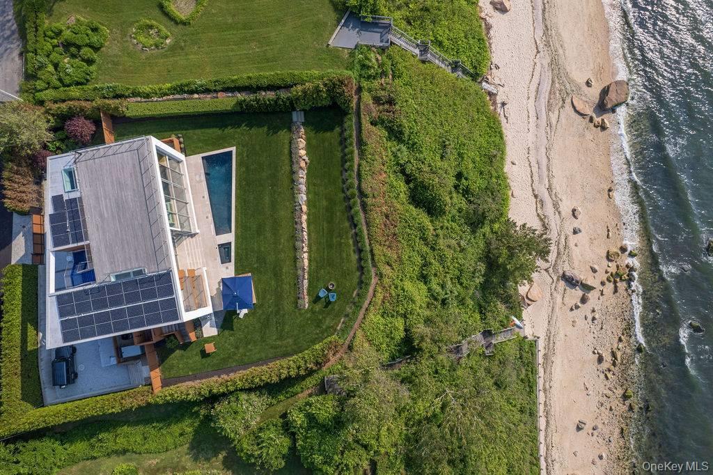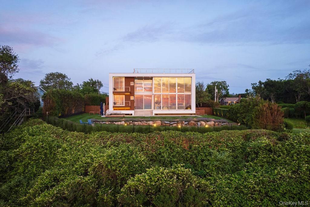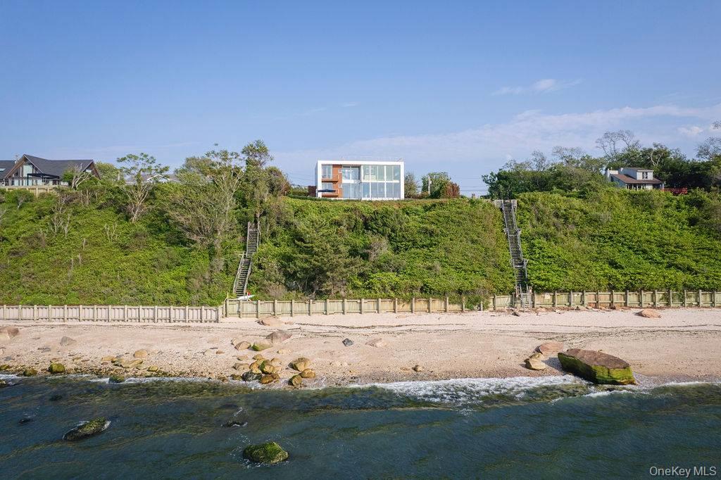 Cutchogue Showstopper. Perched atop a 55-foot bluff overlooking the Long Island Sound, this extraordinary Barnes Coy designed waterfront home offers rare architectural pedigree and an unrepeatable setting. Designed by Barnes Coy Architects, the award-winning firm known for some of the East End’s most distinctive modern residences, this 4,200 SF jewel box estate is set within a private neighborhood with its own park and private stairs to the beach. Filled with natural light and premium finishes, the home features polished limestone floors with radiant heat, two primary ensuite bedrooms with ample closet space, smart home technology controlling lights, blinds, temperature, and front gate; solar panels for energy efficiency, and a full-house generator. The lower level with full bath offers flexible space for a media room, gym, office, or guest overflow. An attached two-car garage is also included. Outside, a heated saltwater gunite pool, hot tub, 1000 sf rooftop deck, firepit, and back lawn create an exceptional waterfront setting for entertaining or quiet enjoyment. Enjoy breathtaking sunsets from the rooftop deck or pool, practice yoga with wide water views, or watch seals gather on the rocks below. An outdoor shower with interior and exterior access adds ease after the beach or pool, and there is room to create an outdoor dining and kitchen area. A truly architecturally significant North Fork offering with exceptional water views, spectacular sunsets, privacy, and a setting that simply cannot be recreated.