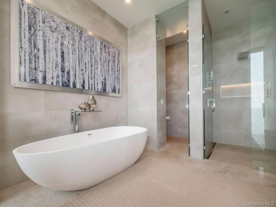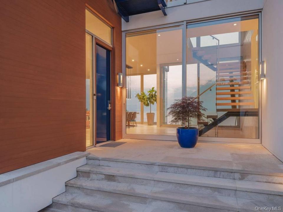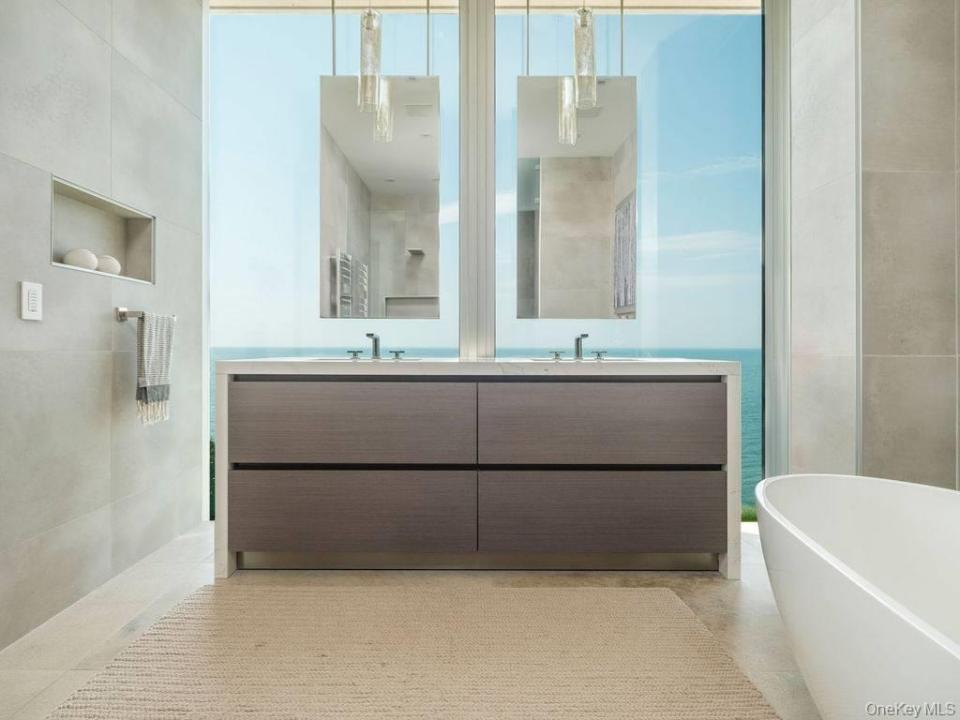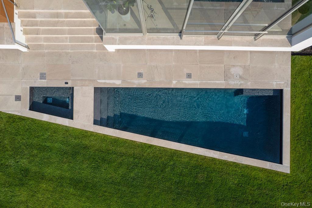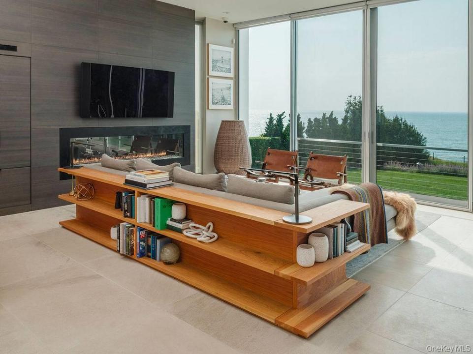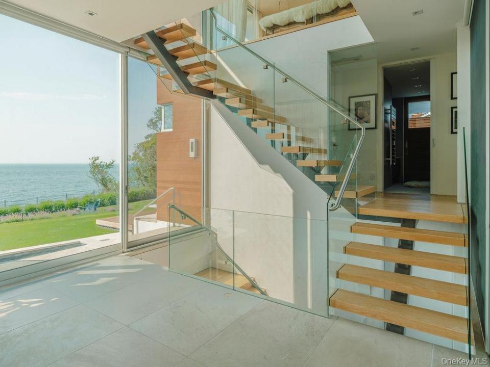 Cutchogue Showstopper. Perched atop a 55-foot bluff overlooking the Long Island Sound, this extraordinary Barnes Coy designed waterfront home offers rare architectural pedigree and an unrepeatable setting. Designed by Barnes Coy Architects, the award-winning firm known for some of the East End’s most distinctive modern residences, this 4,200 SF jewel box estate is set within a private neighborhood with its own park and private stairs to the beach. Filled with natural light and premium finishes, the home features polished limestone floors with radiant heat, two primary ensuite bedrooms with ample closet space, smart home technology controlling lights, blinds, temperature, and front gate; solar panels for energy efficiency, and a full-house generator. The lower level with full bath offers flexible space for a media room, gym, office, or guest overflow. An attached two-car garage is also included. Outside, a heated saltwater gunite pool, hot tub, 1000 sf rooftop deck, firepit, and back lawn create an exceptional waterfront setting for entertaining or quiet enjoyment. Enjoy breathtaking sunsets from the rooftop deck or pool, practice yoga with wide water views, or watch seals gather on the rocks below. An outdoor shower with interior and exterior access adds ease after the beach or pool, and there is room to create an outdoor dining and kitchen area. A truly architecturally significant North Fork offering with exceptional water views, spectacular sunsets, privacy, and a setting that simply cannot be recreated.